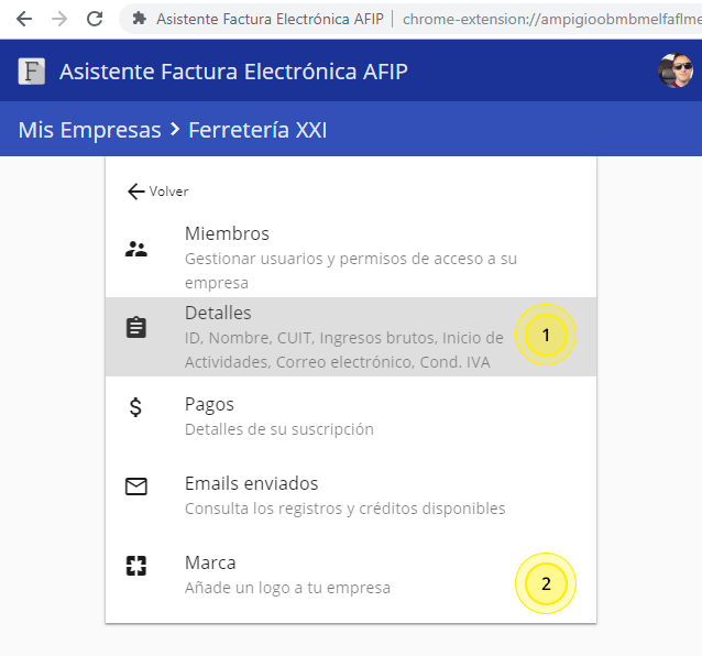 - Configura tu empresa en el Asistente, desde el botón de la extensión > Administrar empresa